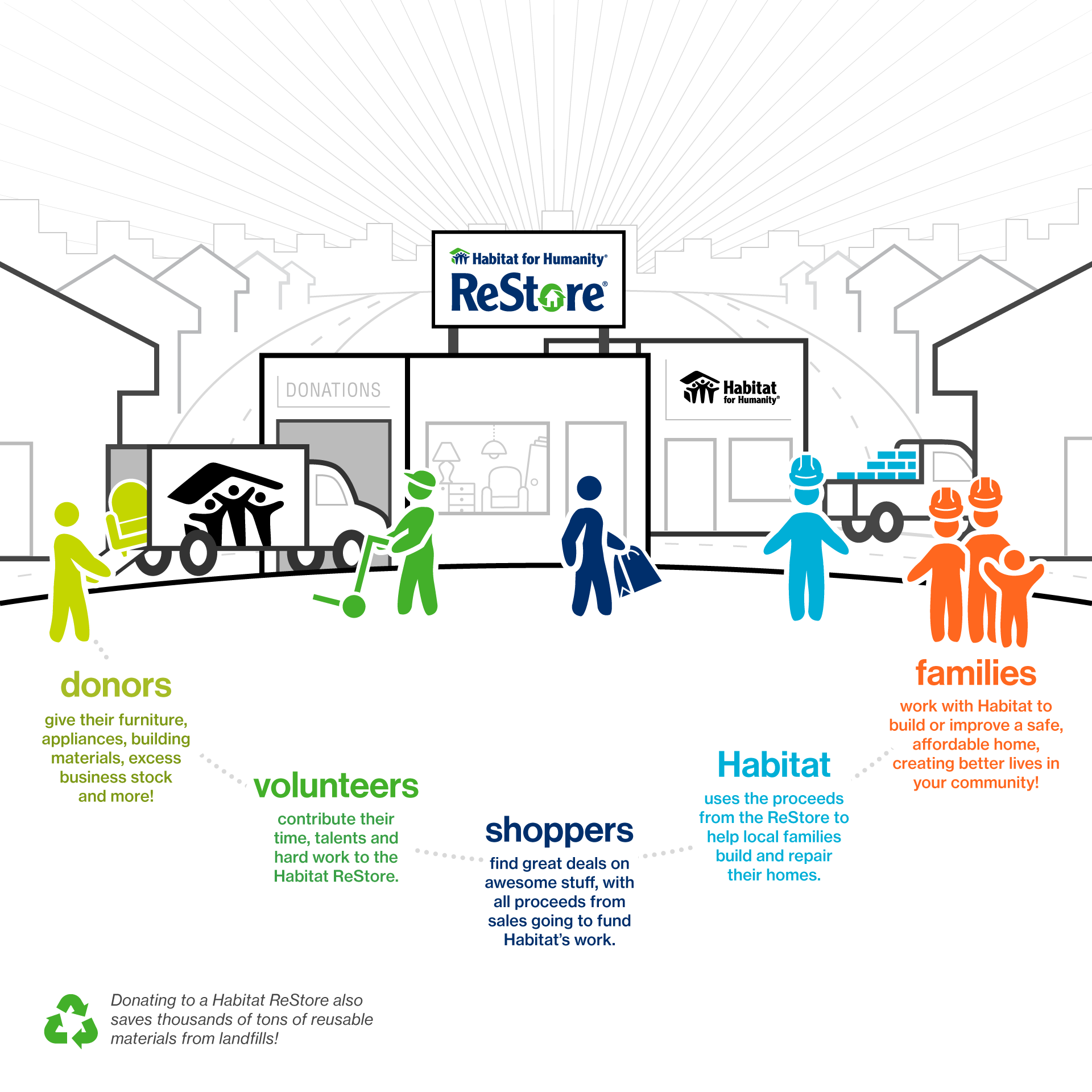 For businesses, donating to the Habitat ReStore is a great way to move discontinued or excess stock, deal with gently used returns and show your customers that you care about the environment and your community. Plus, we’ll pick up your donated goods, which will save you time and money.